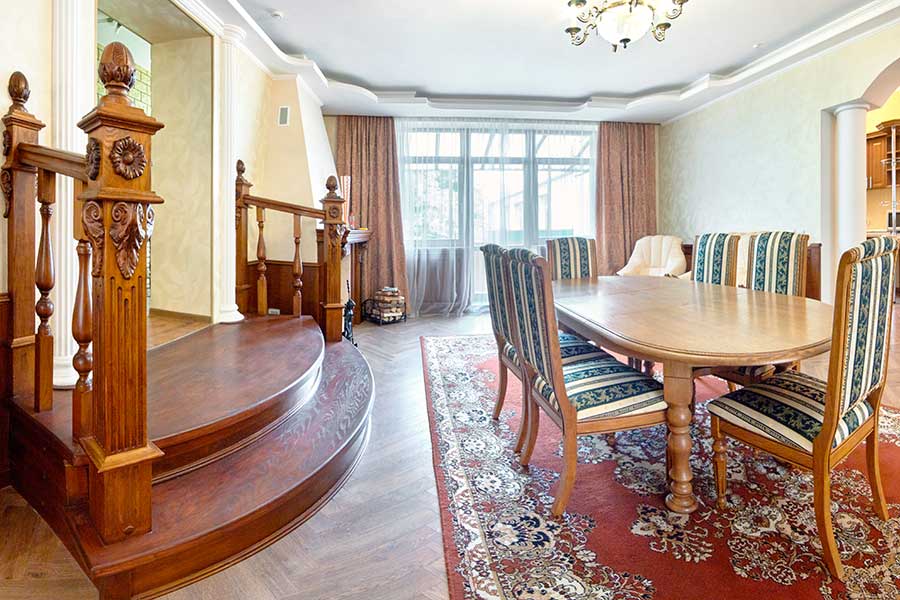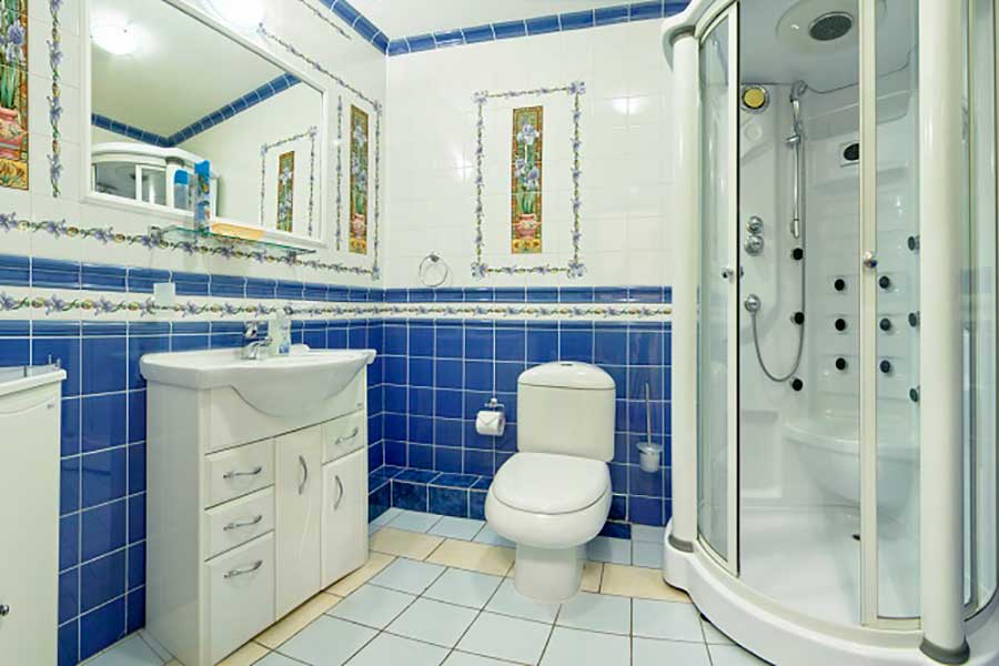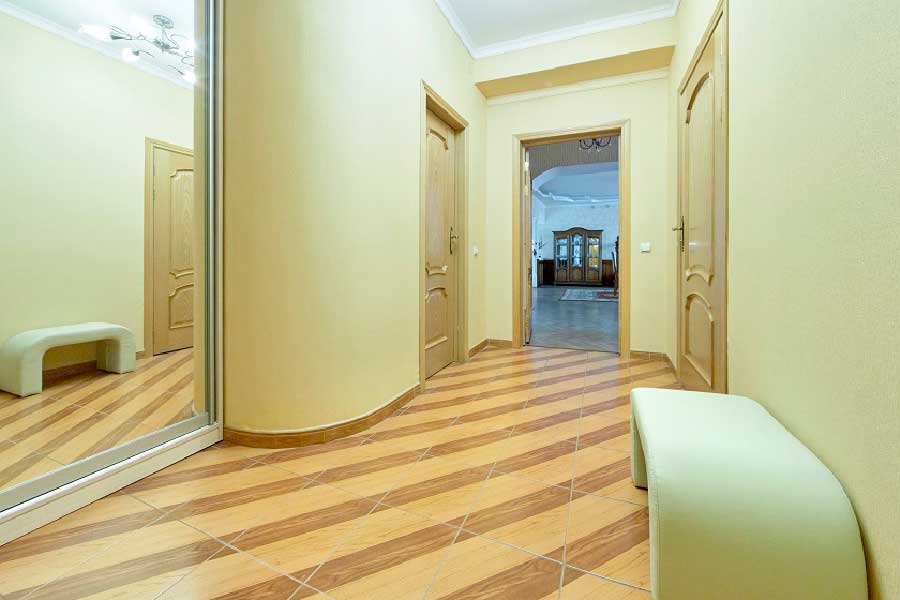 Прихожая, гостиная с балконом, 3 спальни, сауна, 4 ванных комнаты с душевой кабиной/ванной и 5 WC.